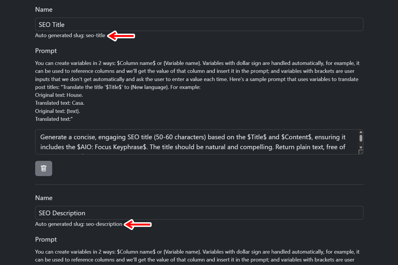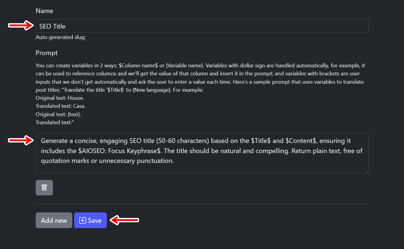 - Enter the Name (e.g., “SEO Title”) and Prompt text.