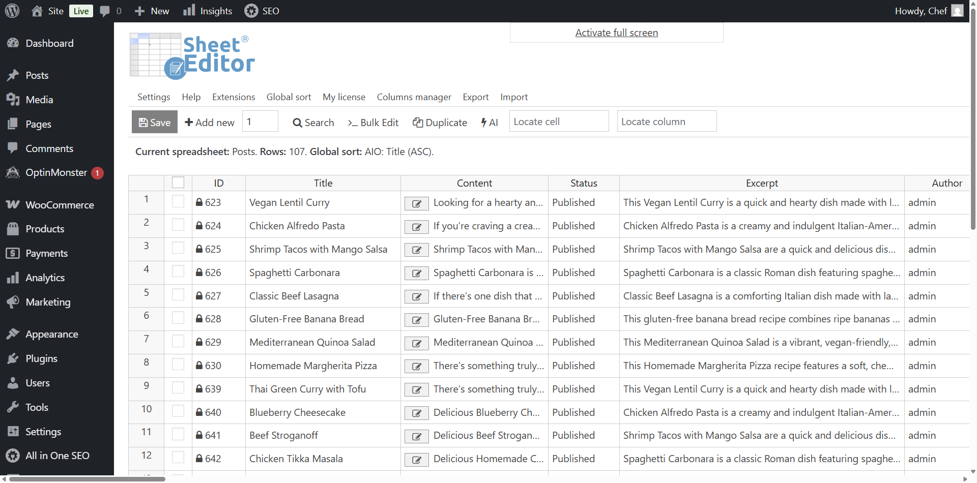 Go to WP Sheet Editor > Edit posts, and you’ll see all your WordPress posts in the spreadsheet.