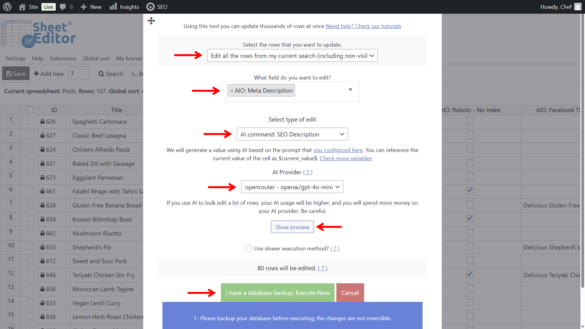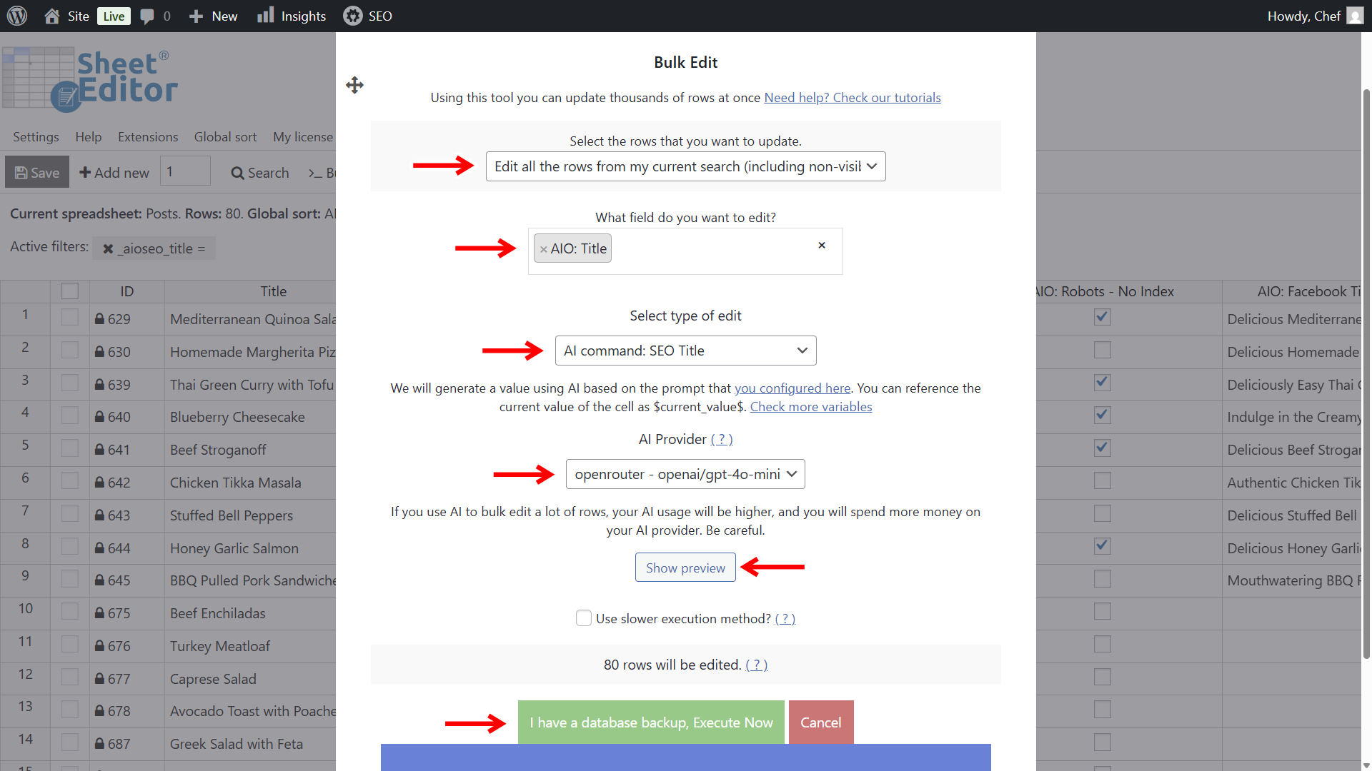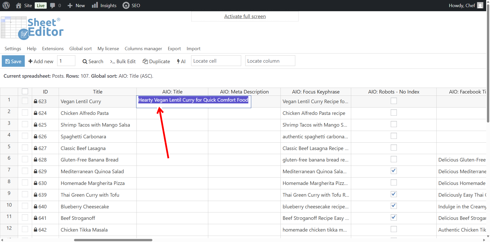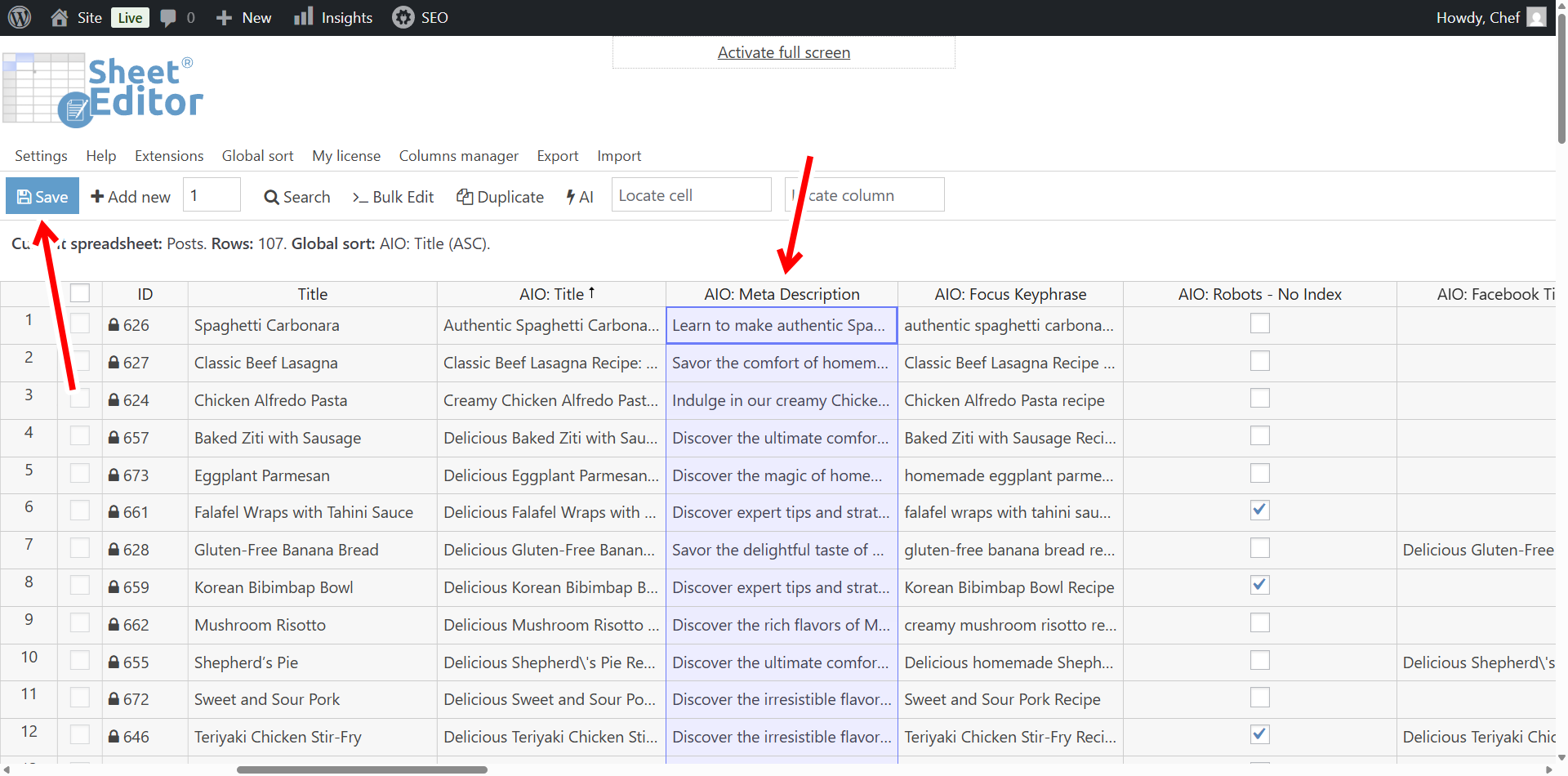 All In One SEO is a popular WordPress plugin that helps enhance your site’s search engine visibility. By integrating it with WP Sheet Editor, you can manage AIOSEO fields directly in a spreadsheet. And with the power of generative AI, you’ll streamline your SEO workflow like never before!