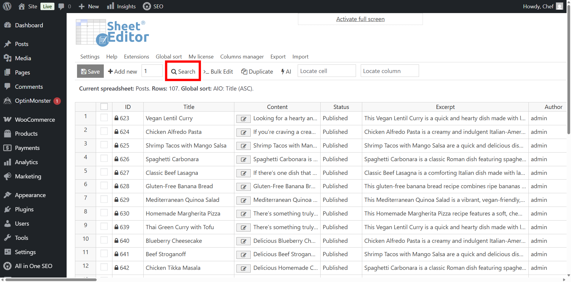 This plugin allows you to view and manage WordPress posts, pages, and custom post types using an intuitive spreadsheet with advanced search, bulk edit, export, and import tools. If you already have it, you can skip this.