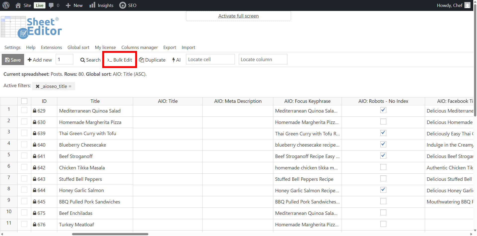 Once you have filtered the posts missing SEO titles, you can open the Bulk Edit tool.