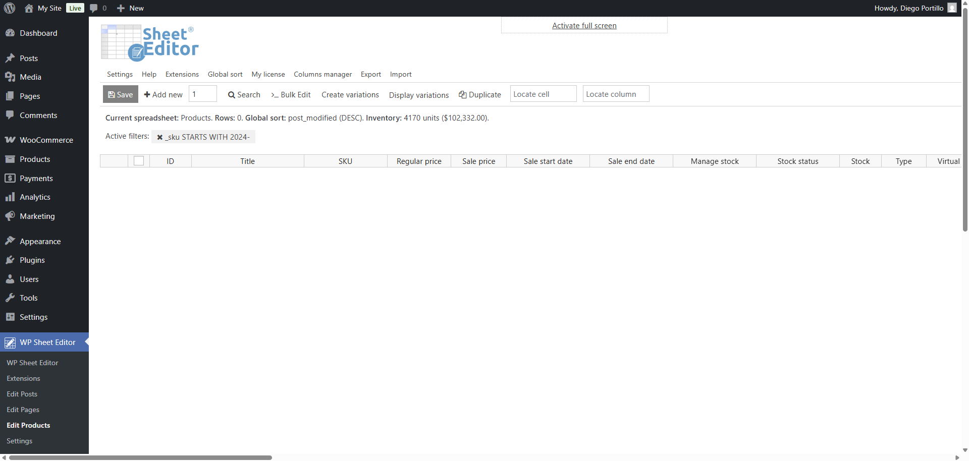 Fortunately, WP Sheet Editor’s advanced search tools allow you to search for your products using any field as a search filter. In this case, you will be able to search for your products by SKU prefix.