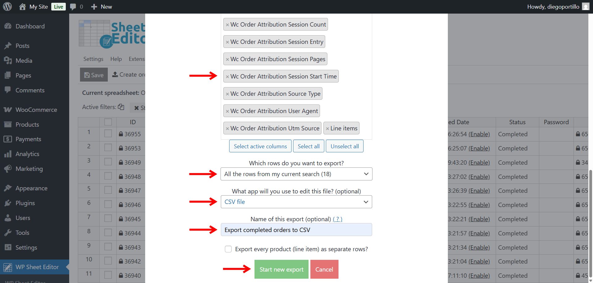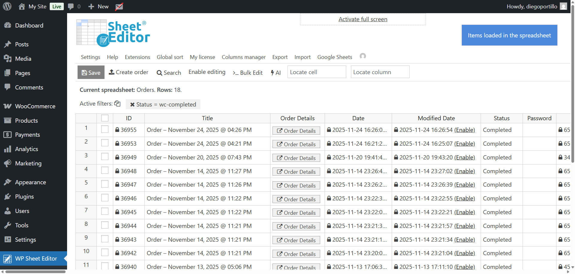 Fortunately, with WP Sheet Editor – WooCommerce Orders, you can instantly filter all completed orders, preview them in the spreadsheet, and export orders with completed status to CSV or Excel with the exact fields you need. There is no manual filtering, no coding, and no cleanup required.