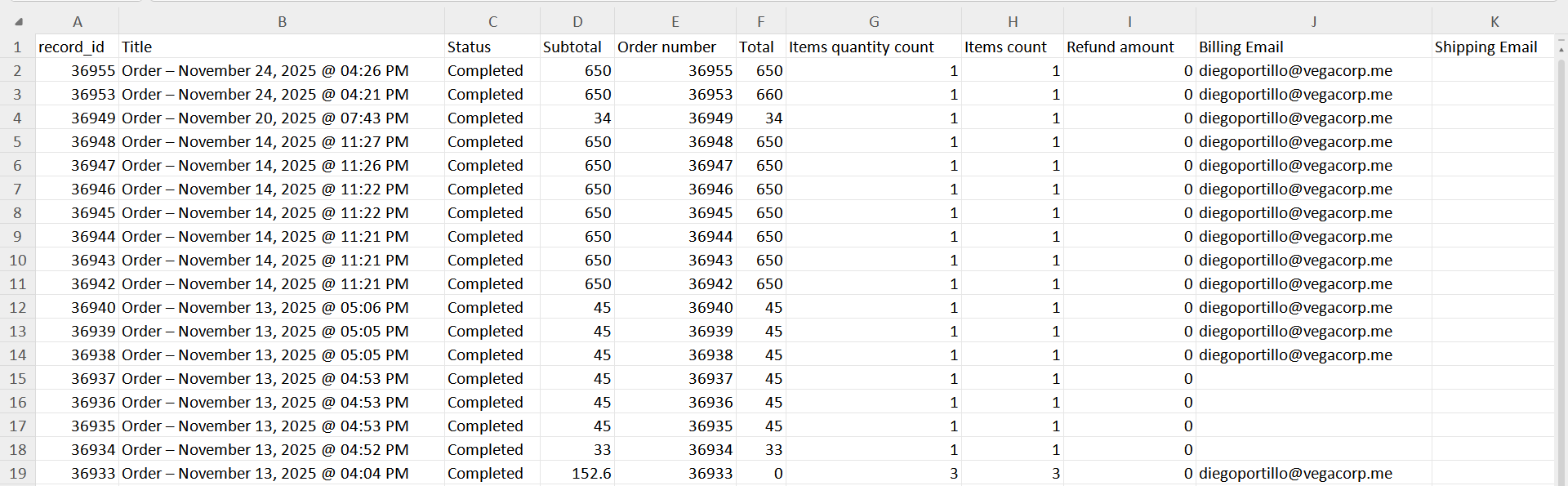 A full spreadsheet of all your WooCommerce orders will load, showing totals, billing details, shipping information, payment method, line items, and any order metadata.