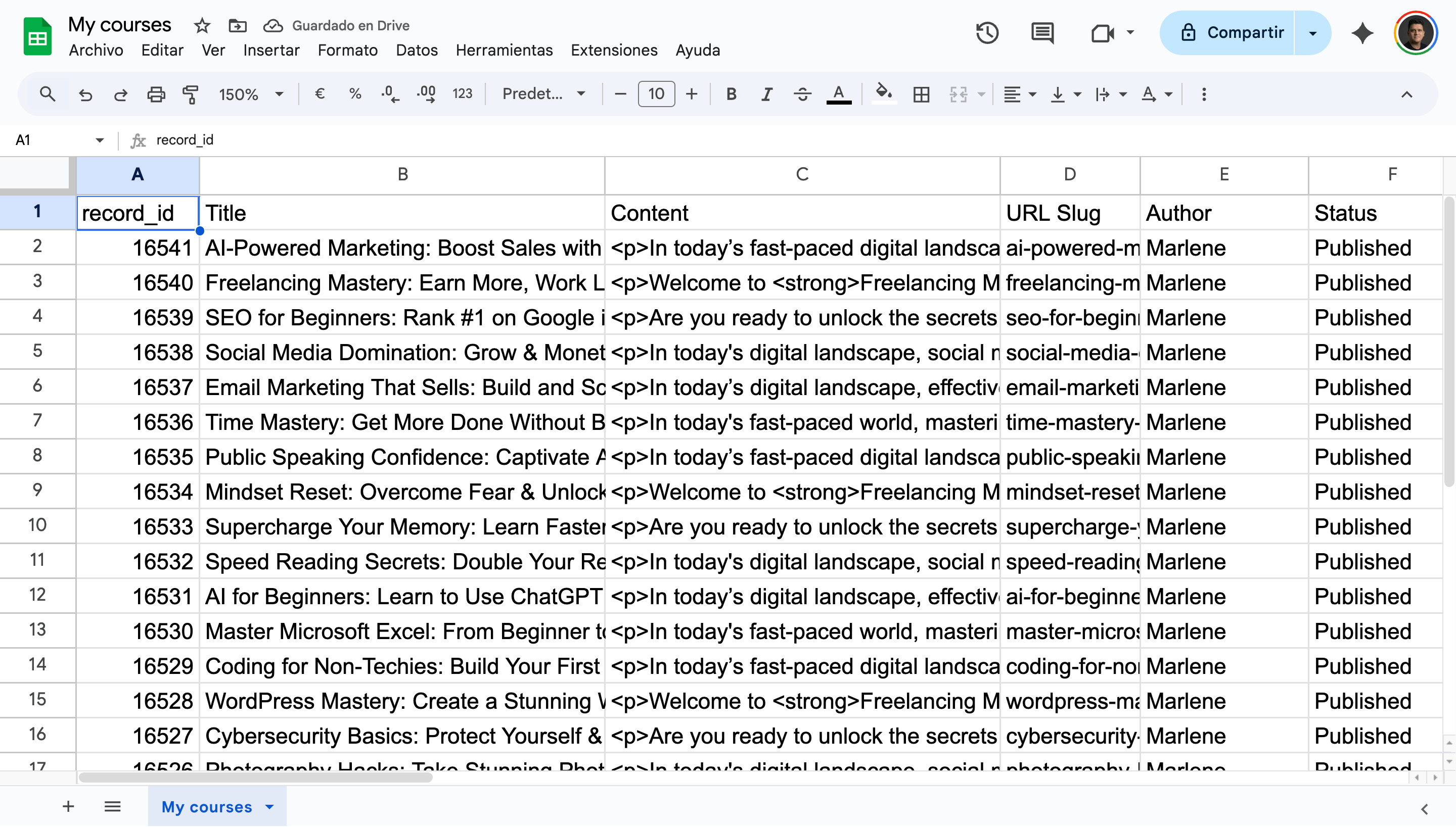 - Offline Editing: Make changes to course titles, slugs, or content in Google Sheets (even from your phone) and import them back later.