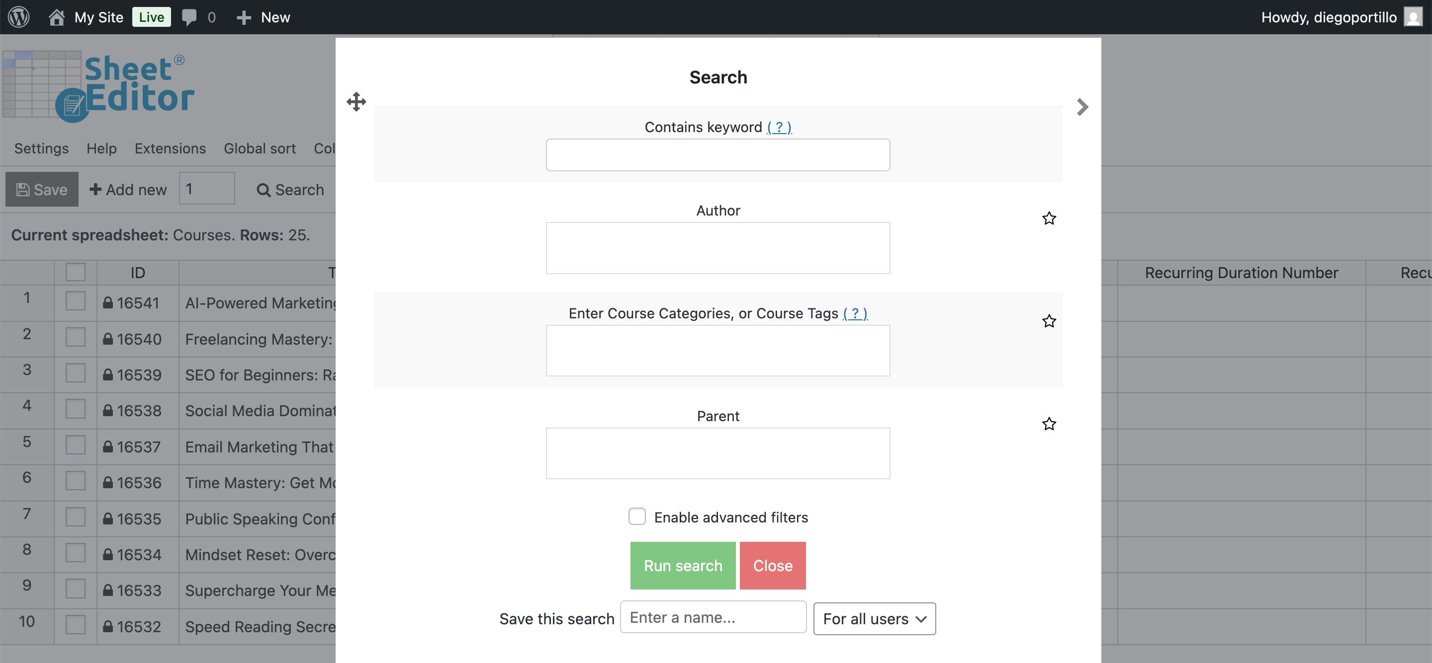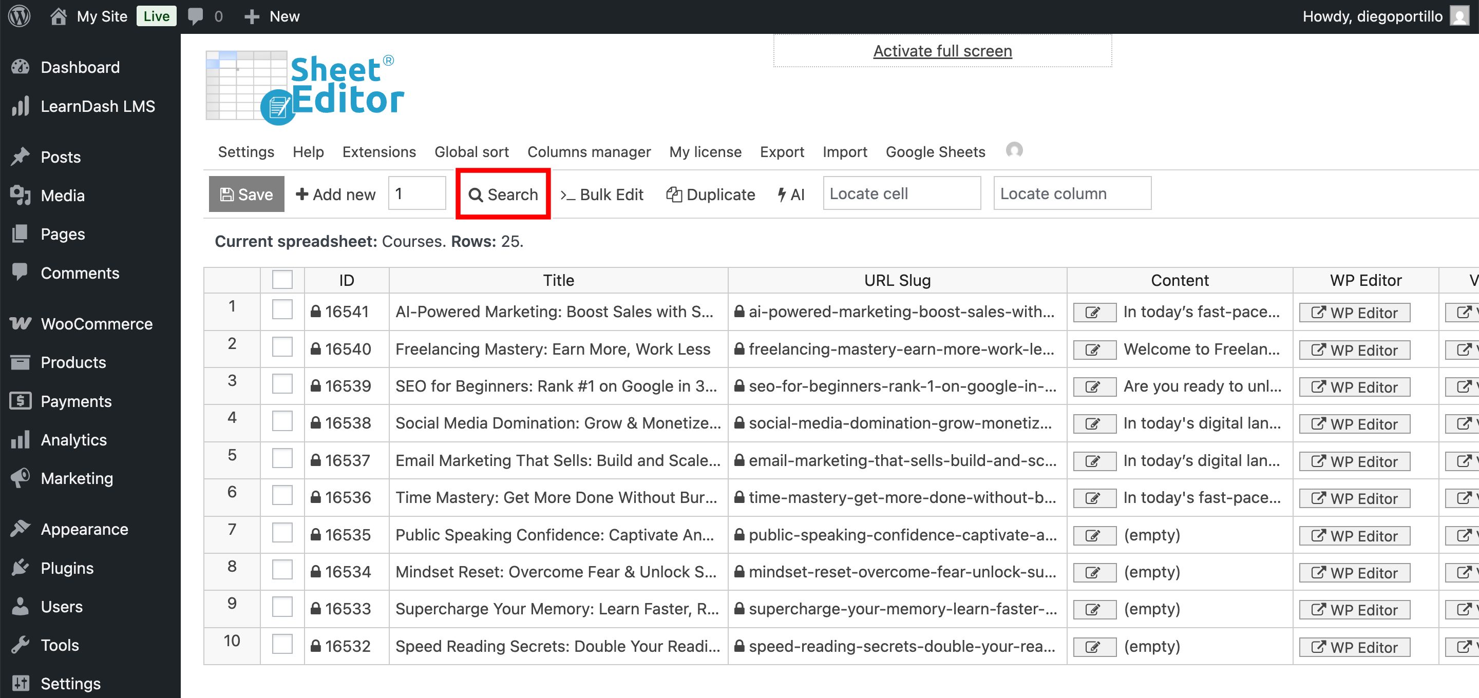 The plugin will load a spreadsheet containing all your courses. You will immediately see the difference compared to the standard WordPress list table. Here, every field is visible and editable.