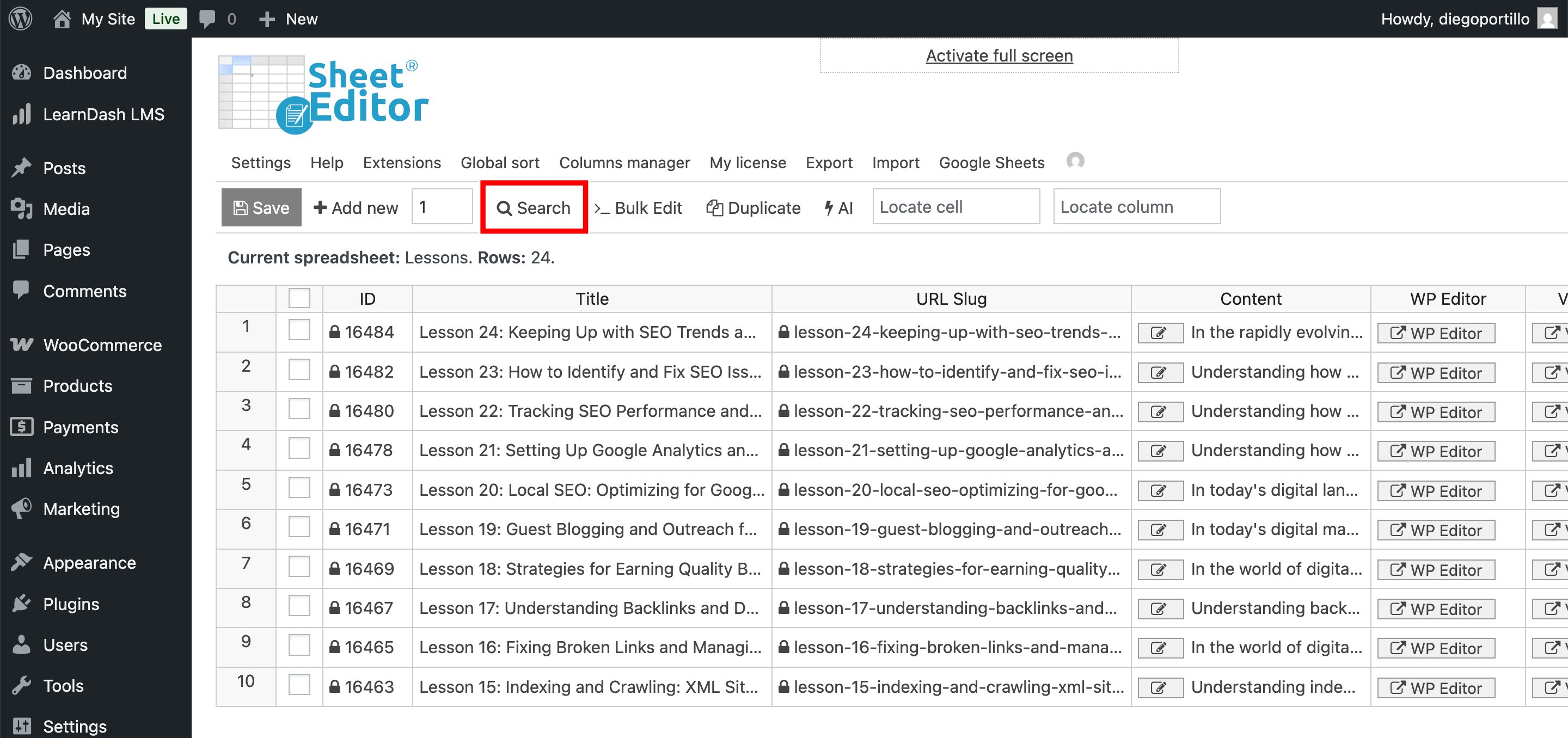 Go to WP Sheet Editor > Edit Lessons. The spreadsheet will show all your LearnDash lessons with columns specifically tailored for LearnDash lessons.