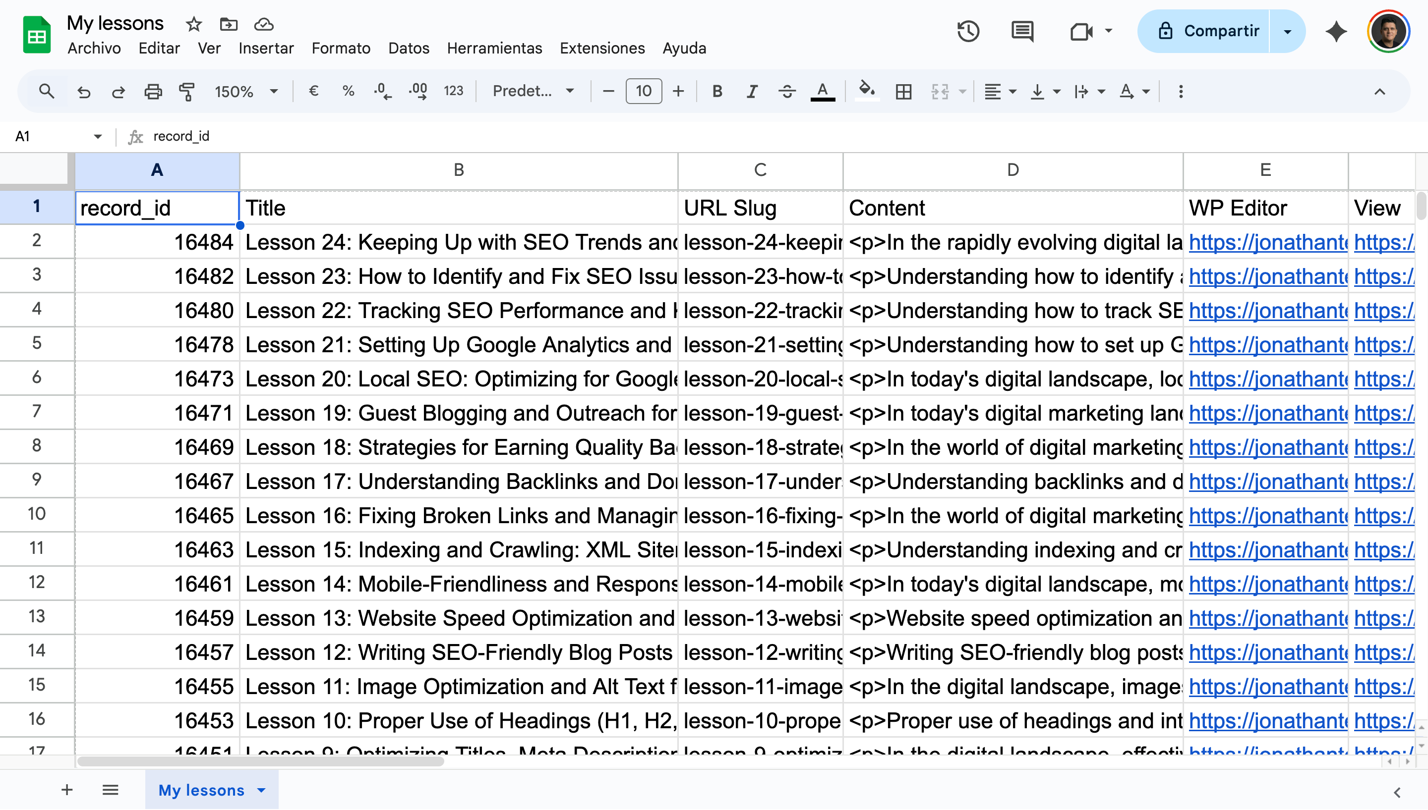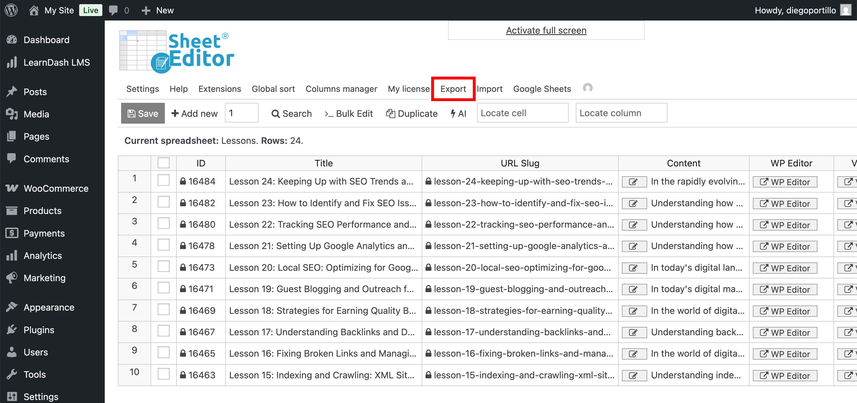 Remember, if you spot errors (like a lesson assigned to the wrong course), you can fix them right there in the sheet and use the Import tool to push those changes back to WordPress.
