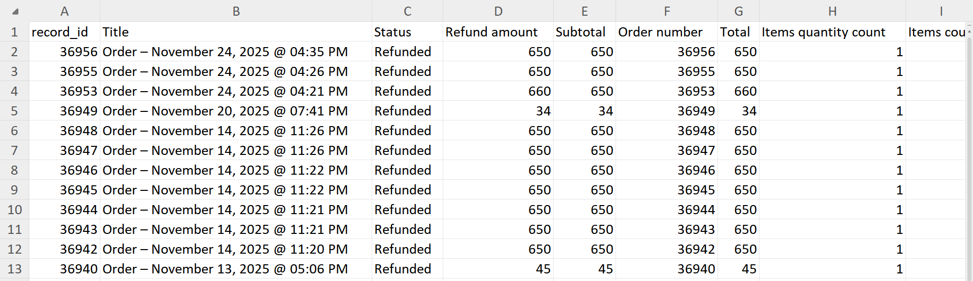 The spreadsheet will now display only orders with the refunded status. You can preview them, sort them, or add extra conditions depending on the report you need.