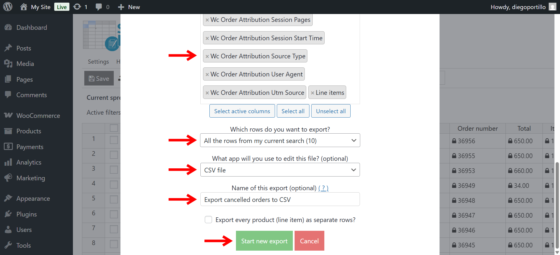 - Name of this export: For example, name the CSV something like “Export cancelled orders to CSV”.