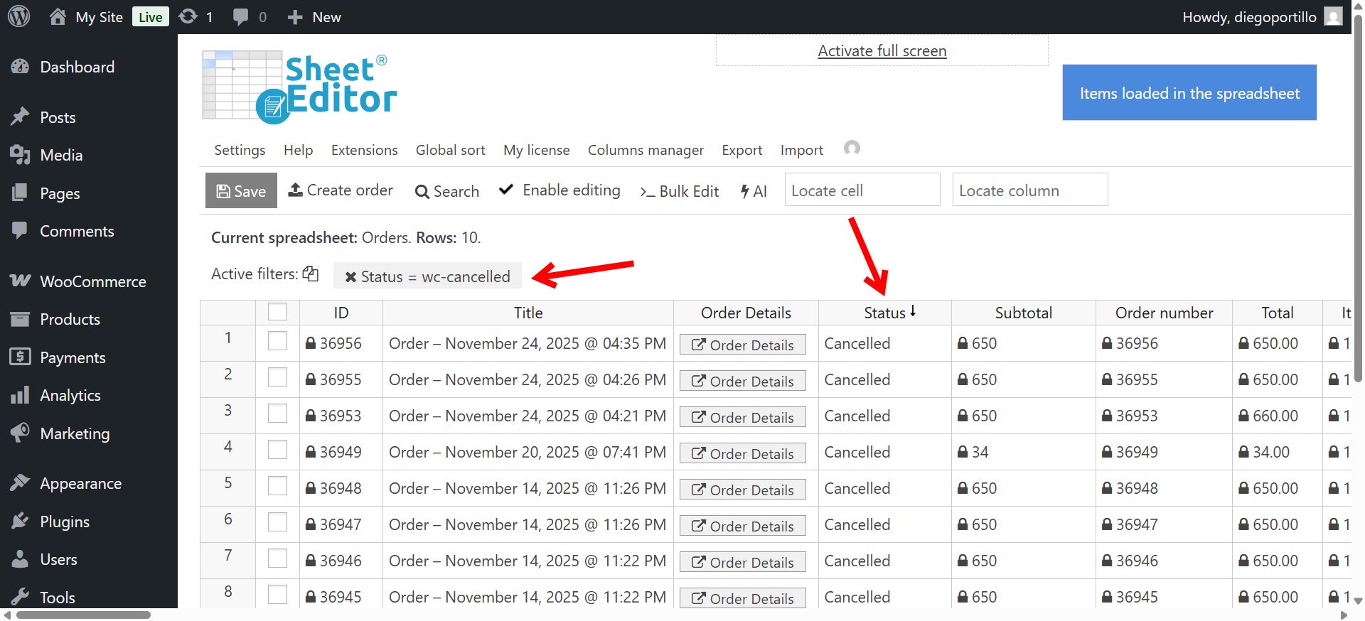 With WP Sheet Editor – WooCommerce Orders, you can easily filter all stopped purchases, view them in a spreadsheet, and extract them to a CSV or Excel file. This gives you the clean data you need to improve your store’s strategy.