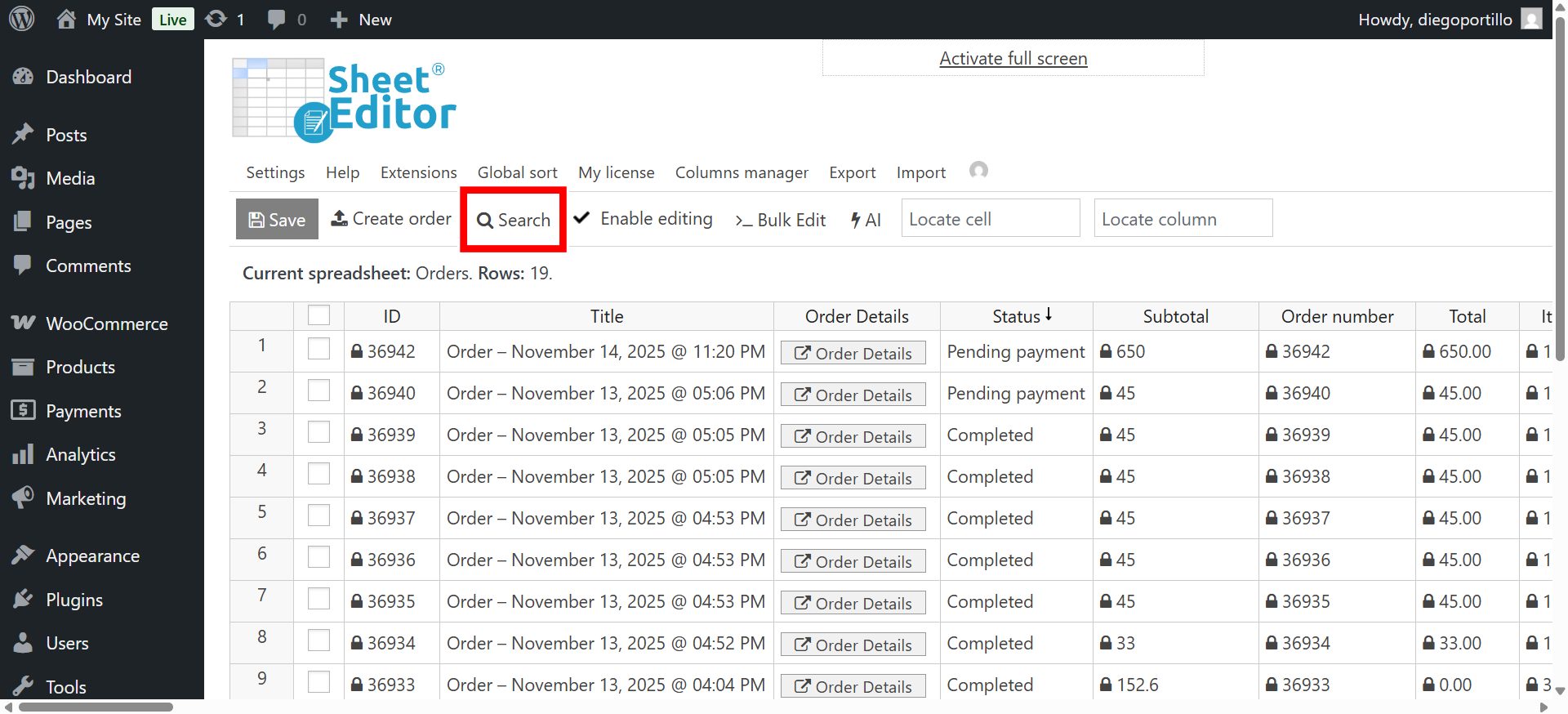 First, go to WP Sheet Editor → Edit orders to open the plugin.