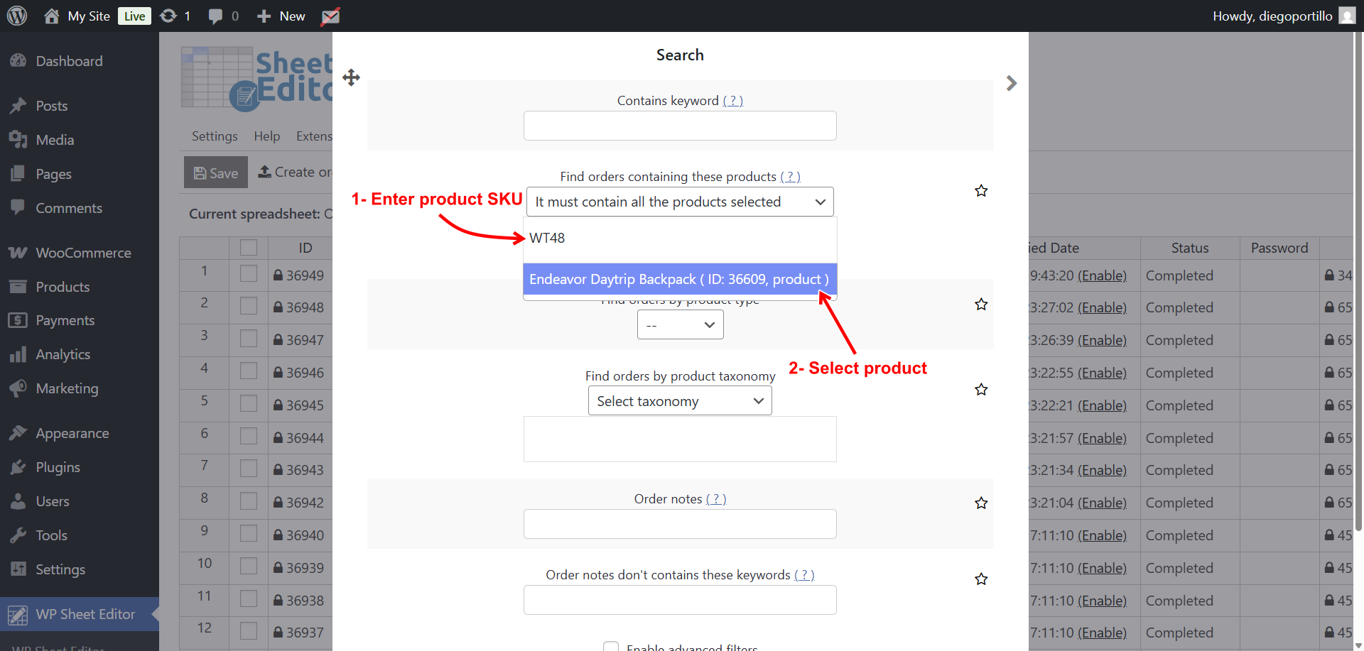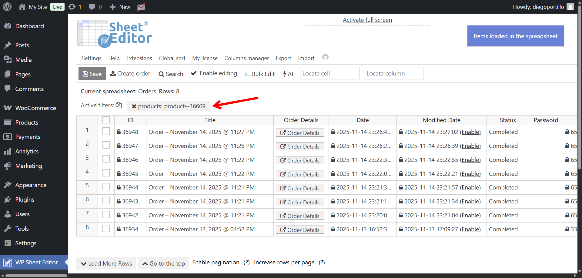 With WP Sheet Editor – WooCommerce Orders, you can search orders by SKU (or by the products containing those SKUs). You can refine results by date or status, and export a clean report to CSV files that you can view and edit with Excel, Google Sheets, or any other CSV editor. Instead of exporting your entire order history and cleaning it in a spreadsheet, filter and download only the orders that contain the SKU(s) you need.