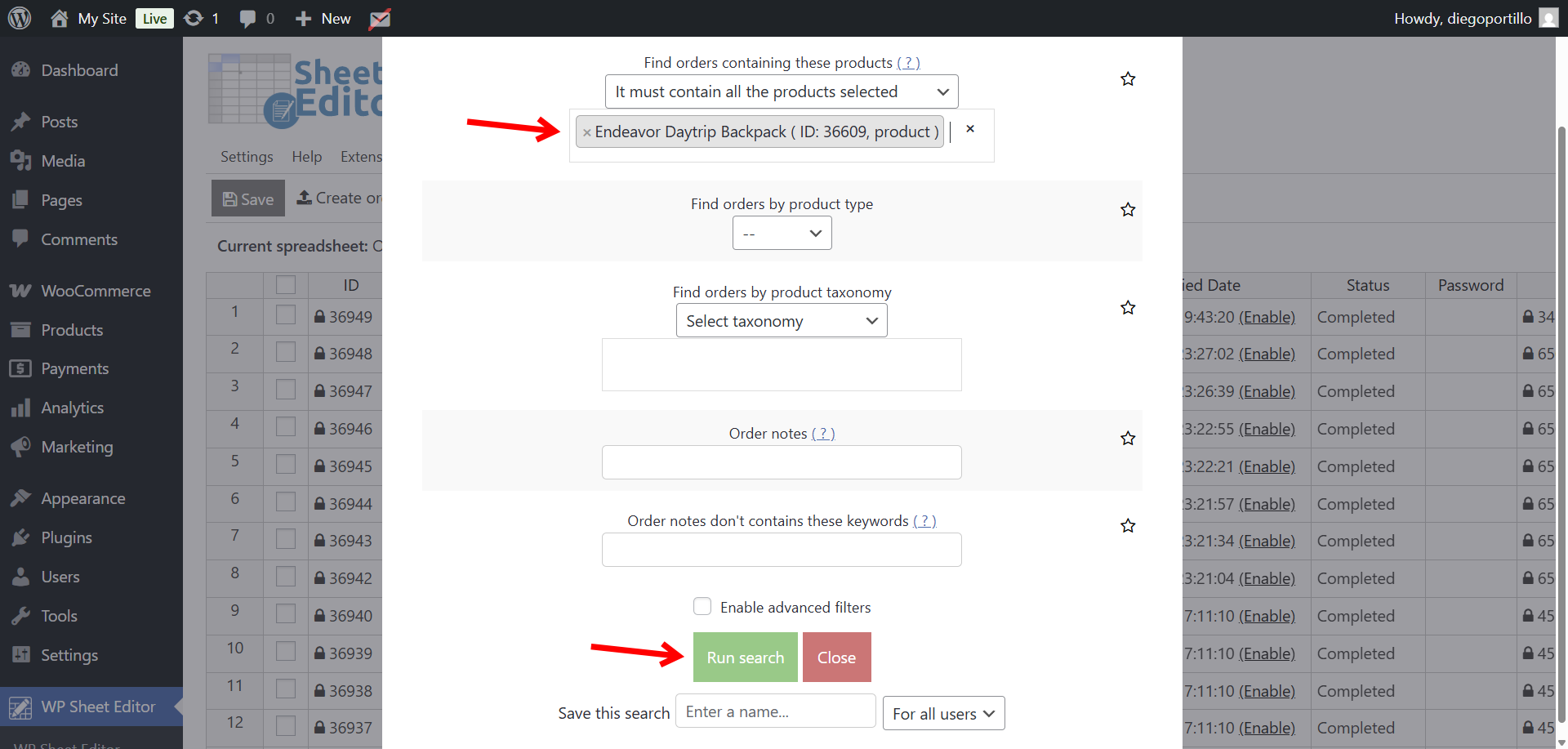 Once you have selected the product/products, click on Run search to filter your WooCommerce orders by SKU.