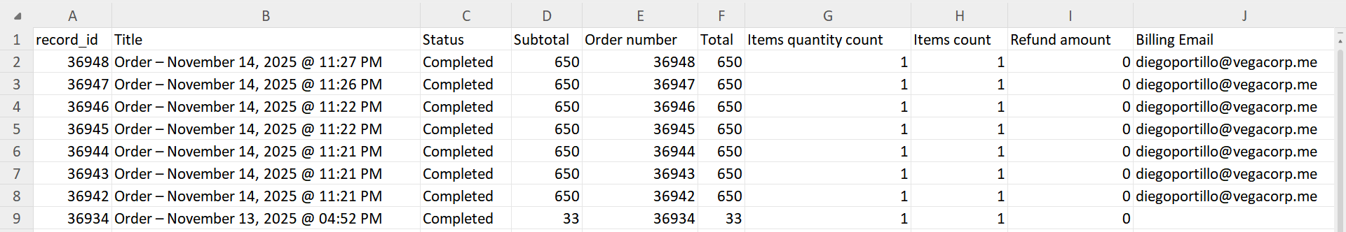 Here’s what the exported CSV file containing orders by SKU looks like: