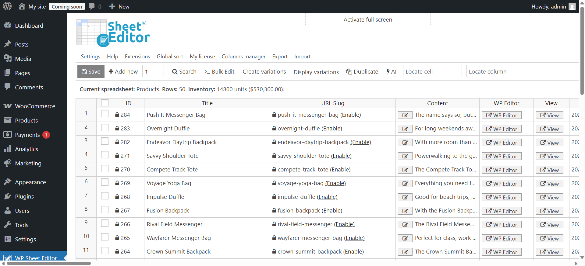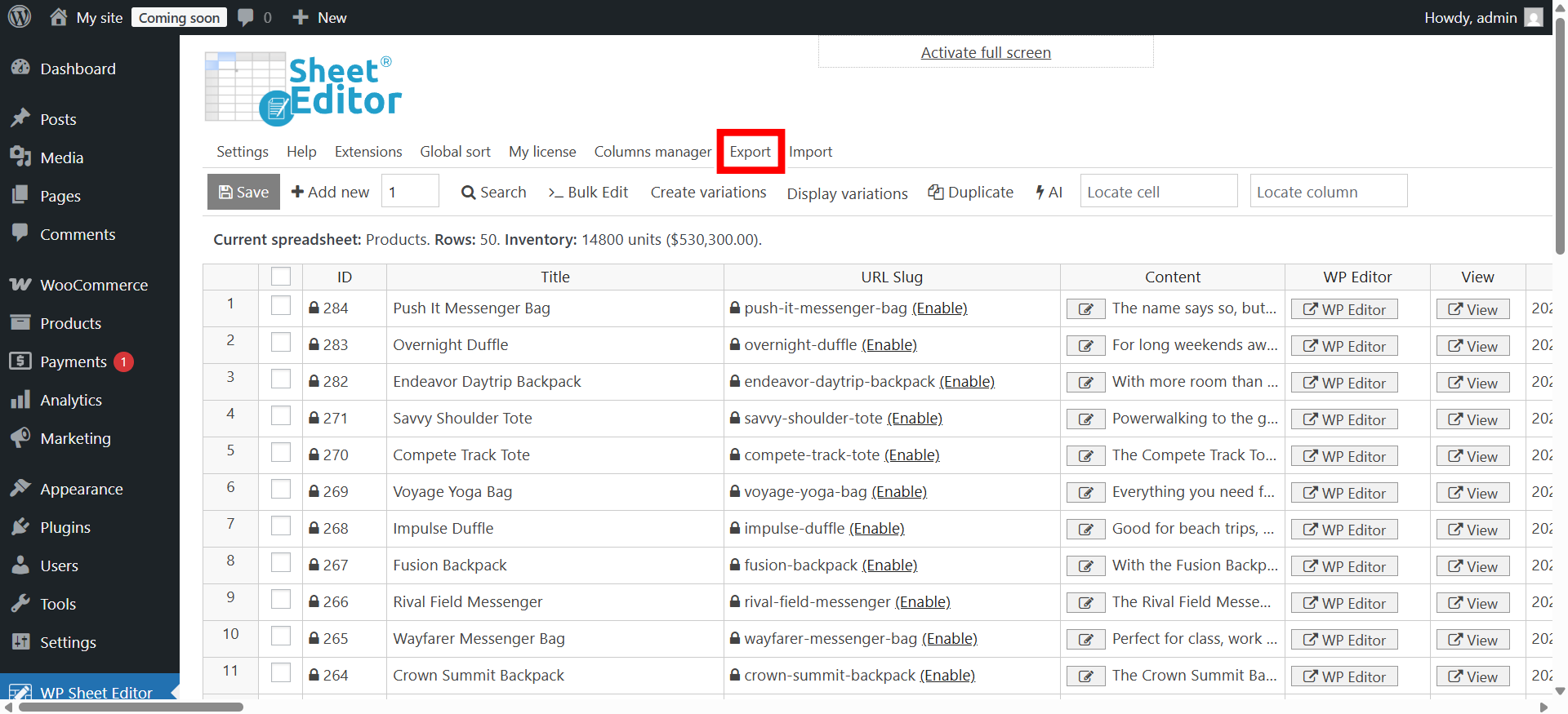 From your WordPress dashboard, locate WP Sheet Editor in the menu and select Edit Products.