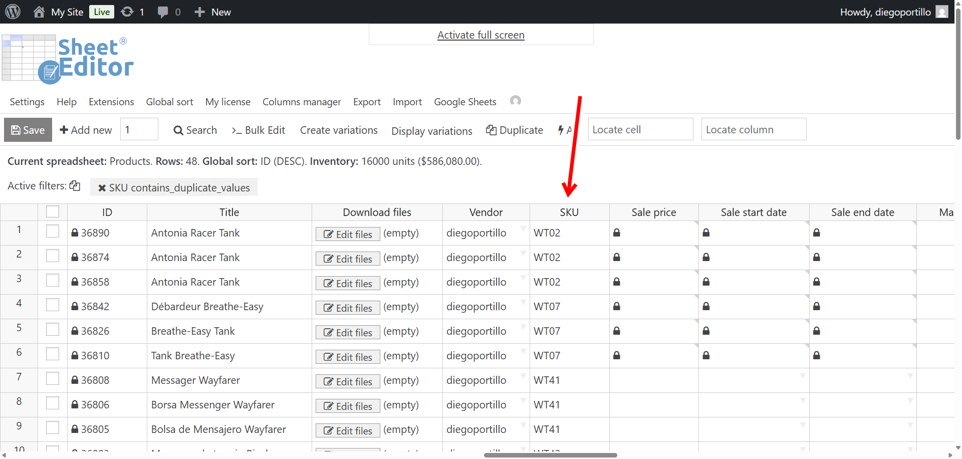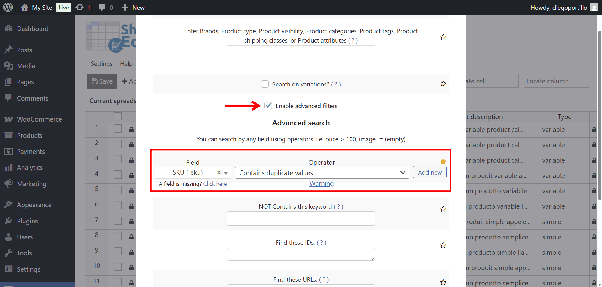 Fortunately, with the WP Sheet Editor – WooCommerce Products plugin, you can now search for all products with duplicate SKUs in just a few clicks using the new “Contains duplicate values” operator in the advanced search filters.