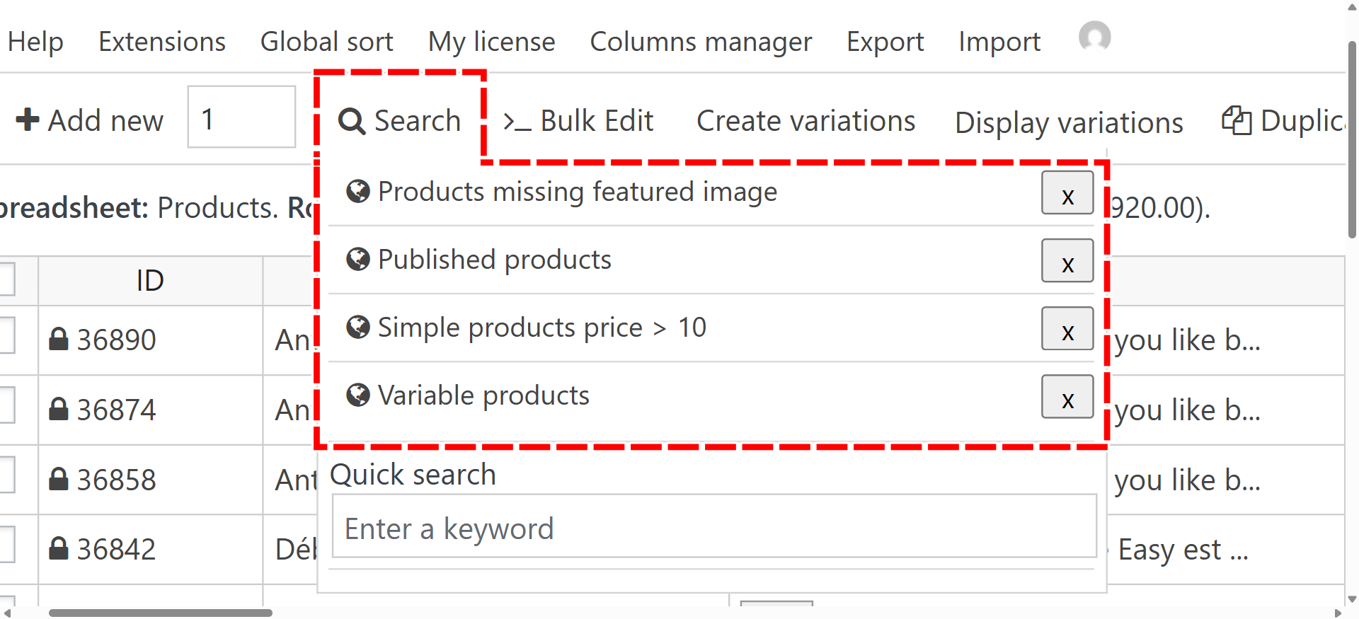 WP Sheet Editor now has a new feature that allows you to quickly reuse your favorite search filters in the spreadsheet.