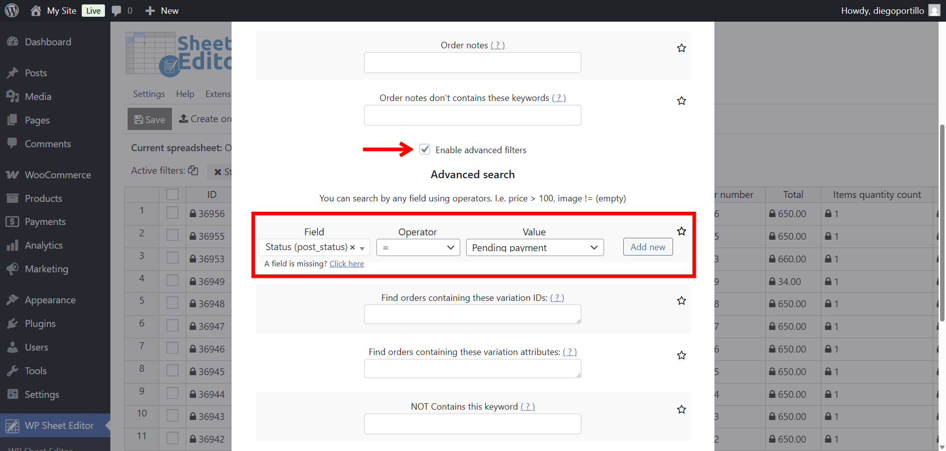 The spreadsheet will refresh and display only orders currently marked as Pending payment. You can sort them, verify customer details, or refine the results with more conditions.