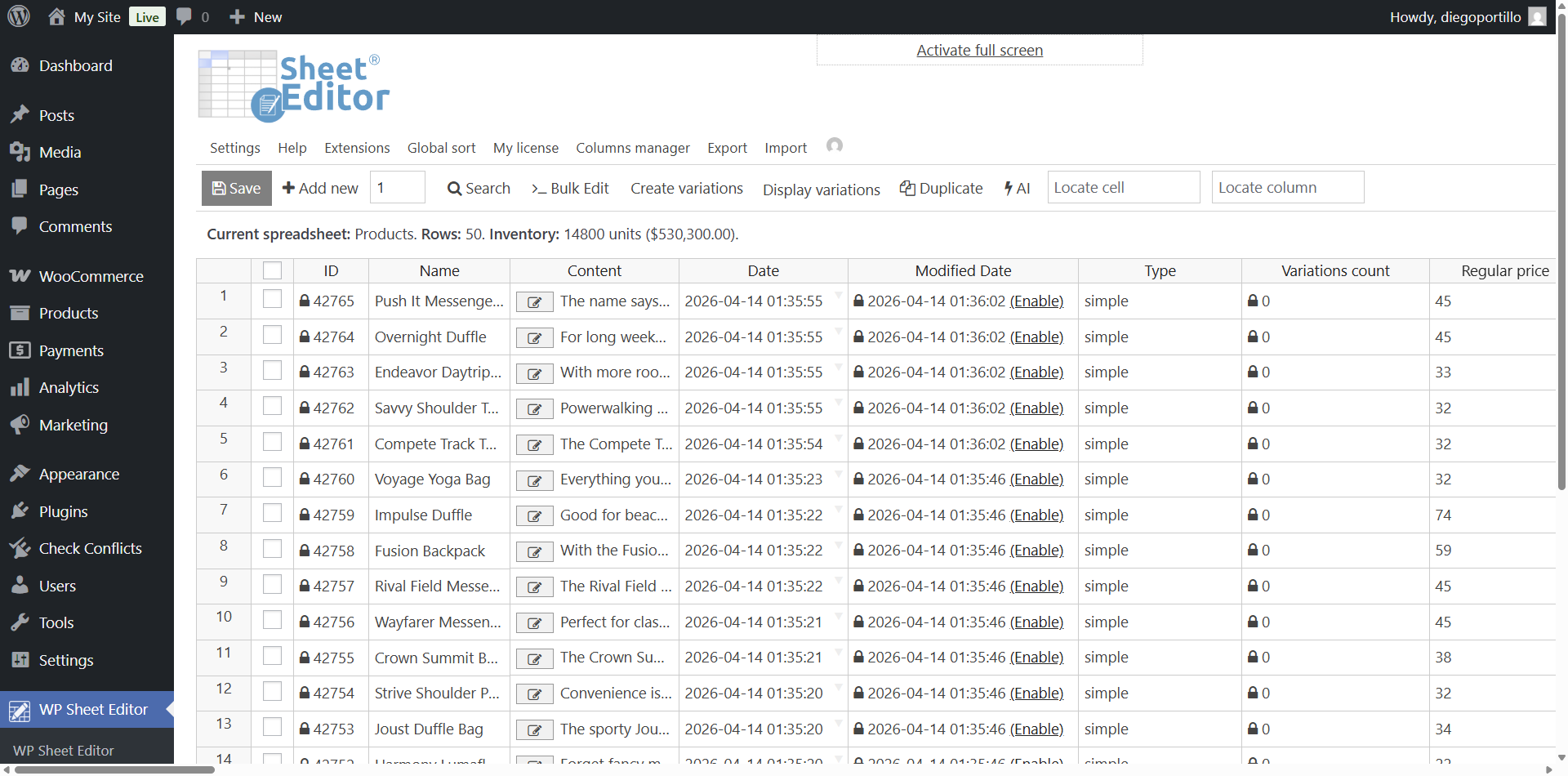 Once installed and activated, navigate to WP Sheet Editor > Edit Products to open the spreadsheet. You will see all your products and their complete metadata organized in columns.