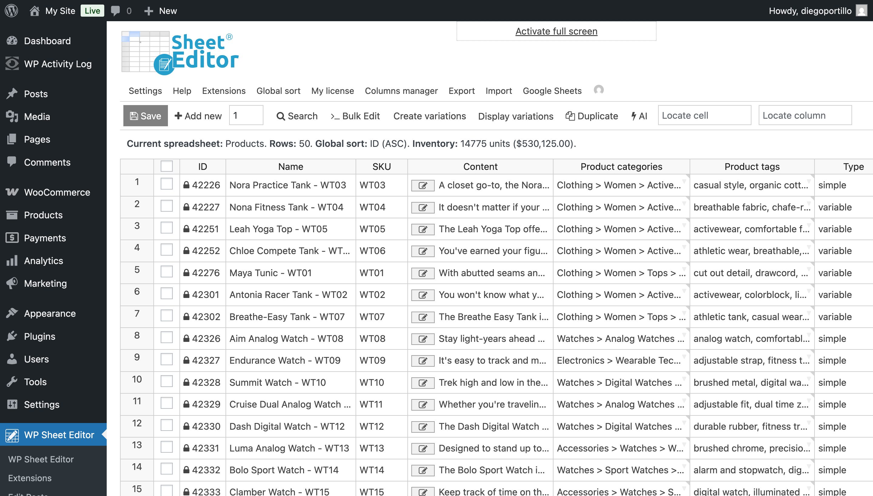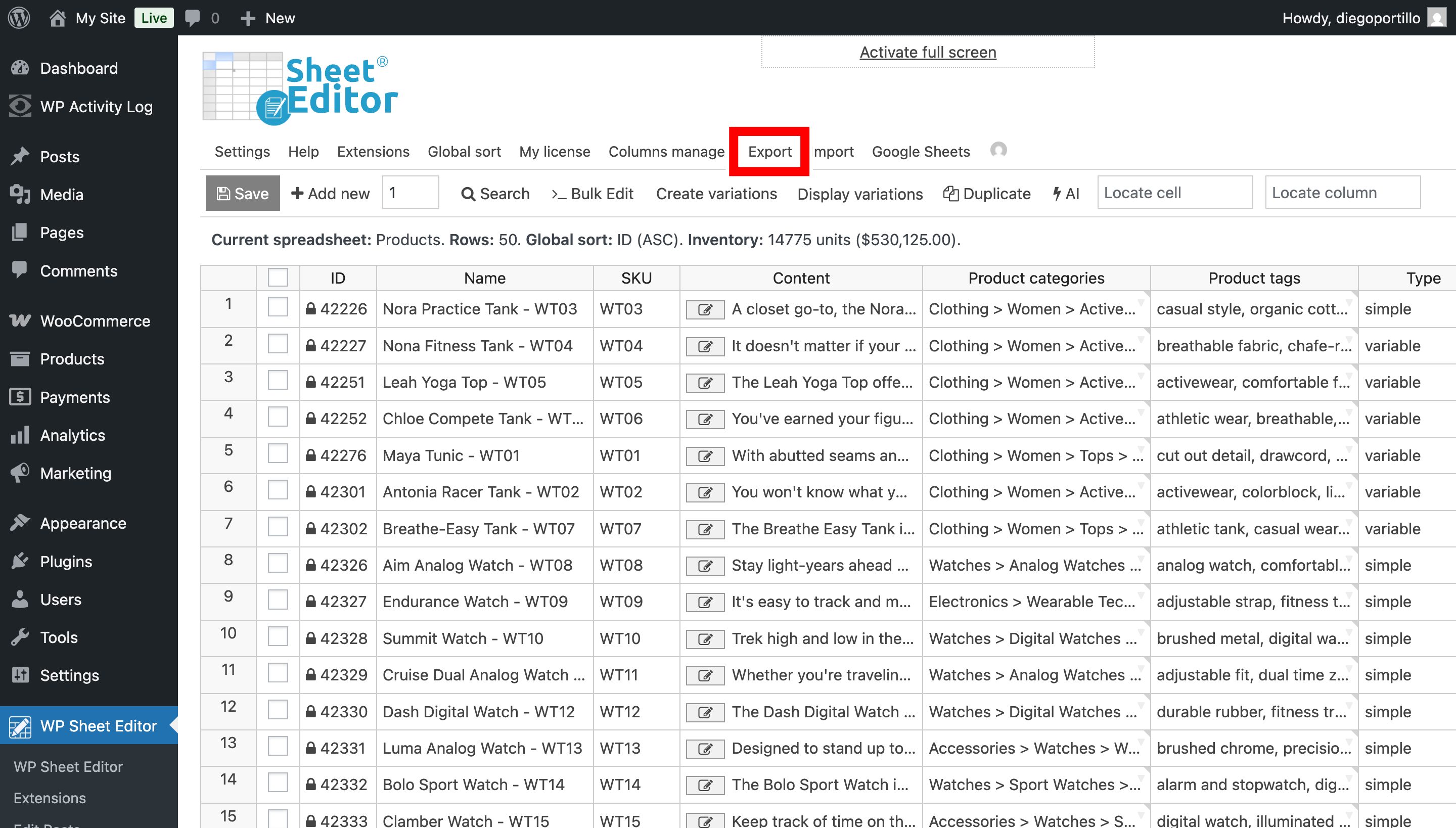 Open the WooCommerce products spreadsheet by going to WP Sheet Editor > Edit Products.
