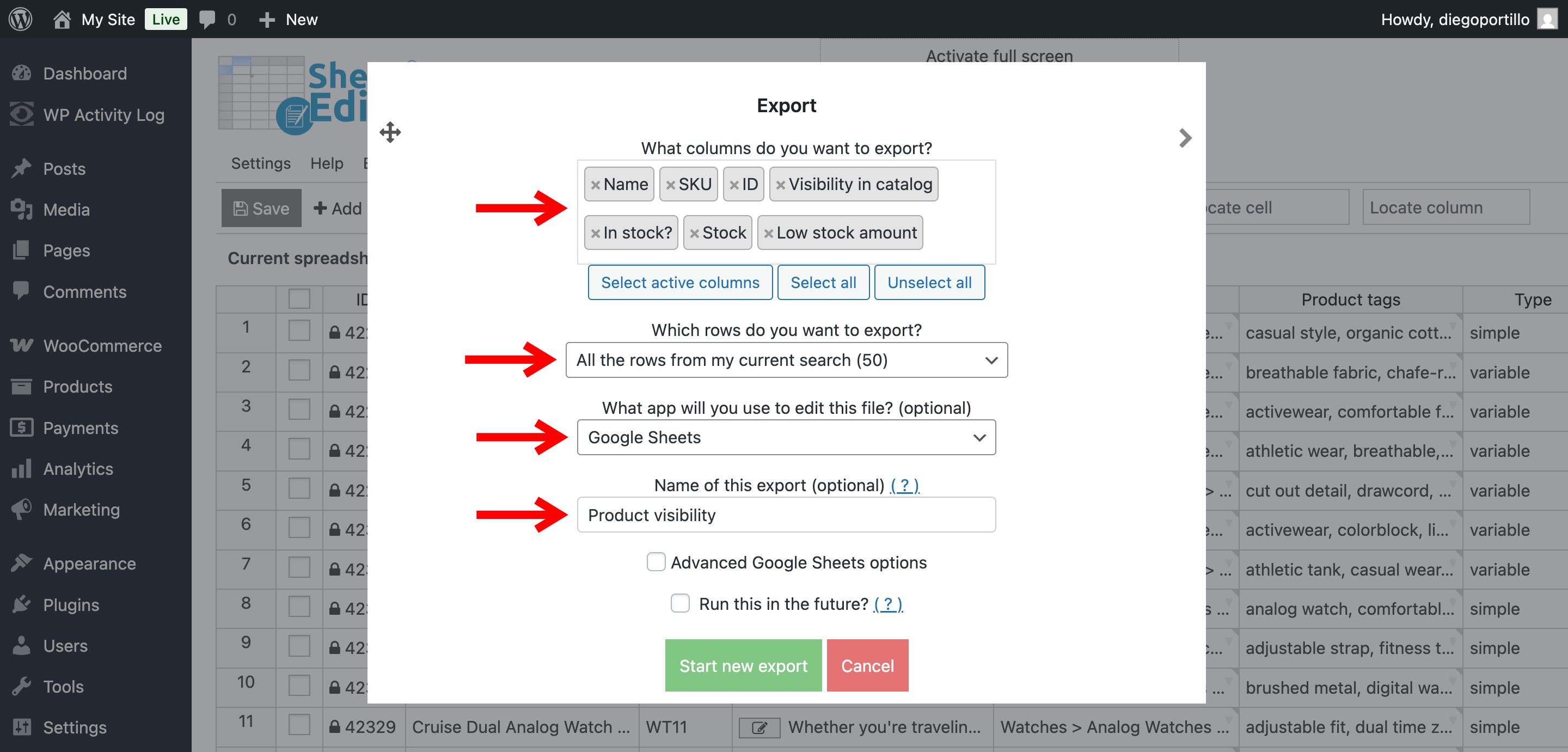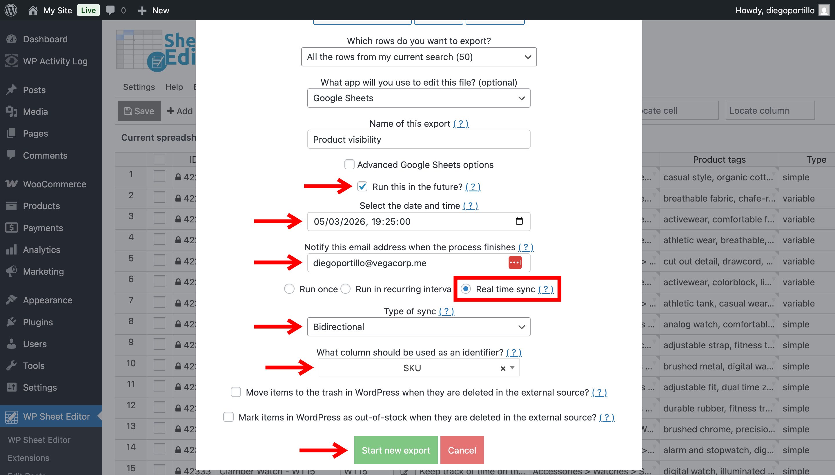 First, we need to send our existing products to Google Sheets and make sure we create a bidirectional real time sync so that the changes we make on WordPress are reflected in Google Sheets, and vice-versa.