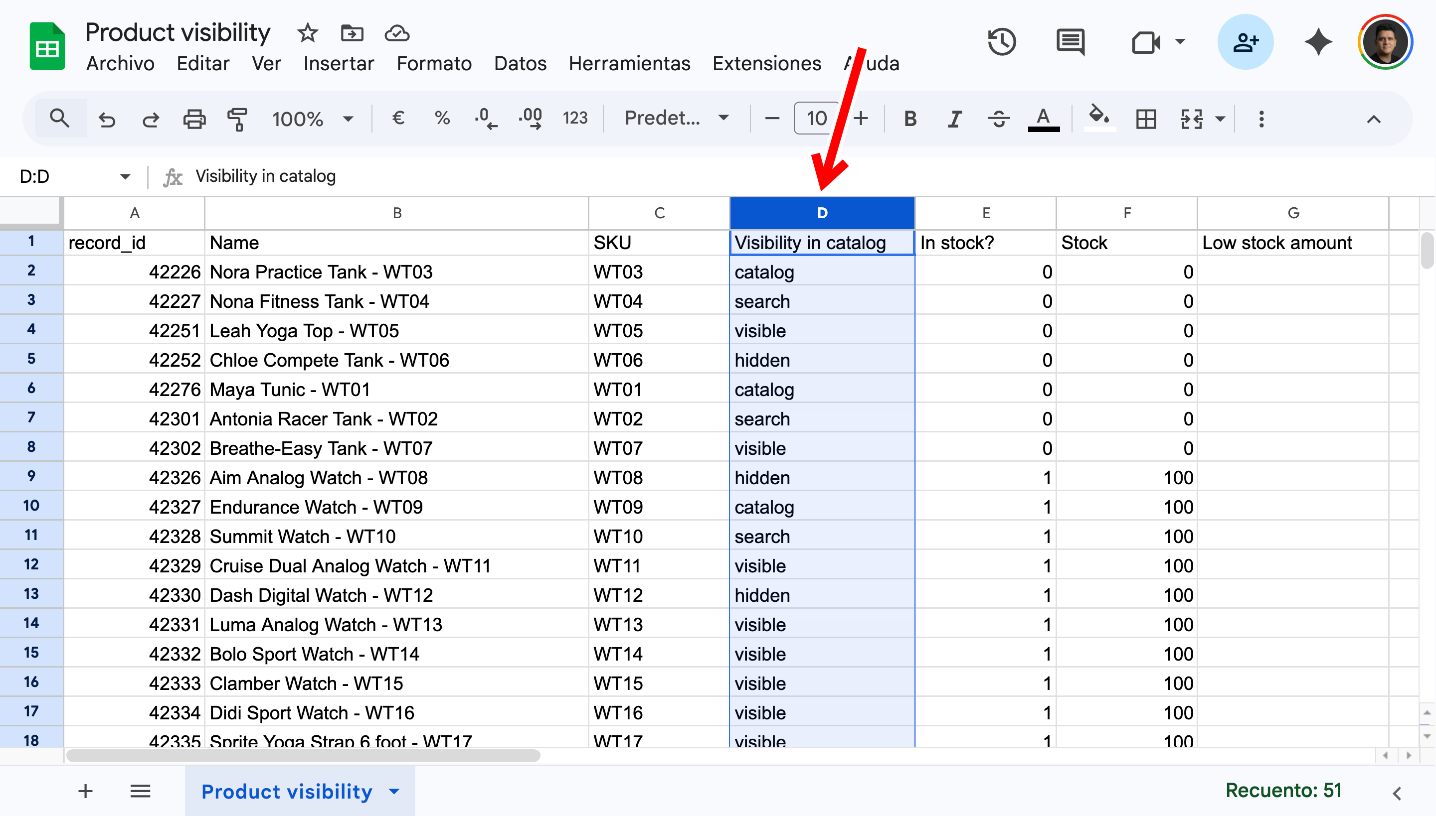 You can now use Google Sheets’ powerful features to manage these statuses. Sort your sheet by categories, find all out-of-stock items, and change their Catalog Visibility to hidden in bulk.