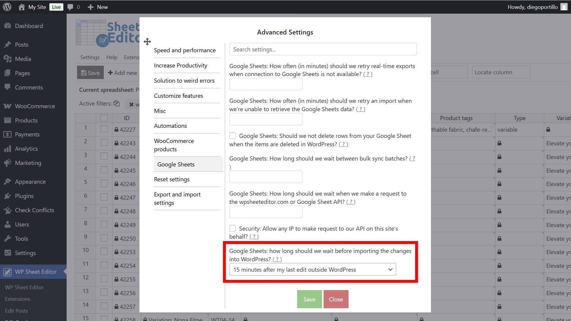 To avoid importing incomplete data while you are still working, WP Sheet Editor has a built-in delay. It will wait for a specified period after you have finished editing in Google Sheets before pushing the updates to your live store.