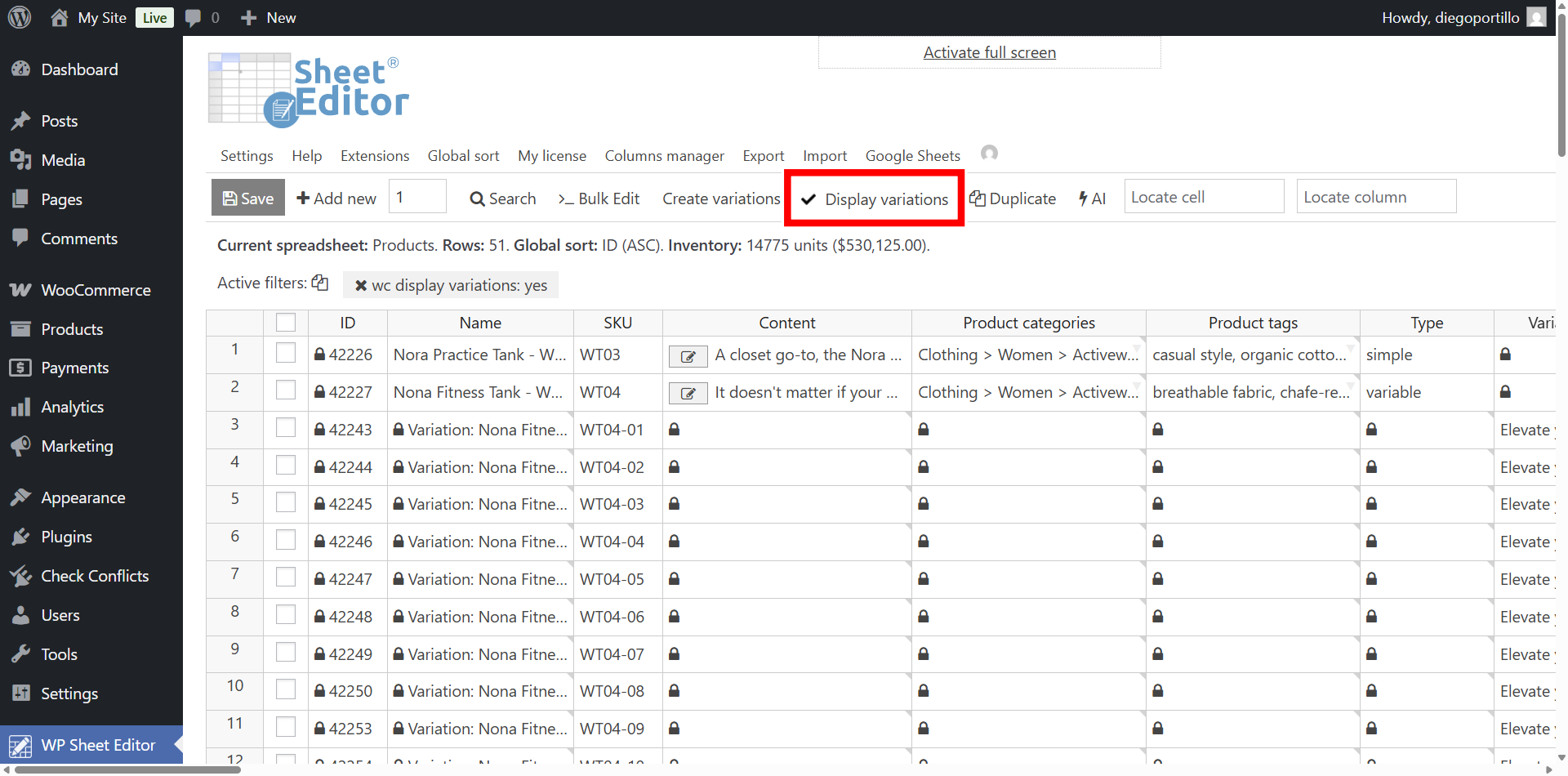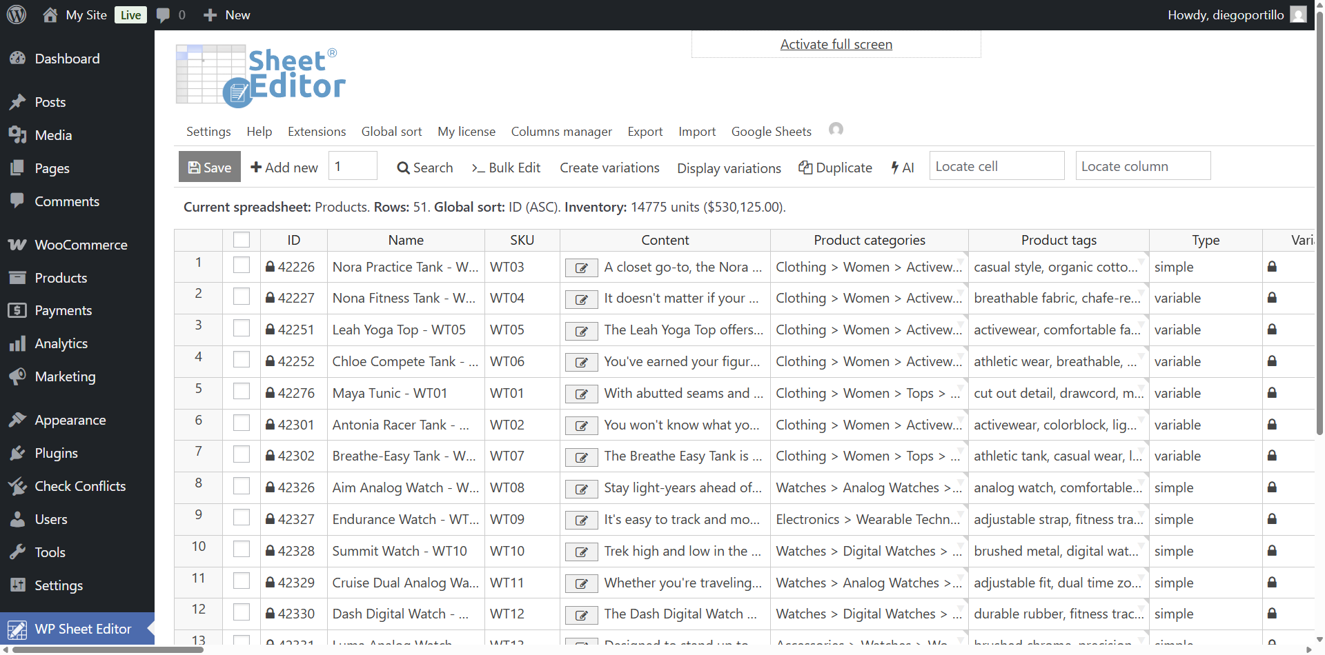 You’ll see all your WooCommerce products displayed in the spreadsheet.