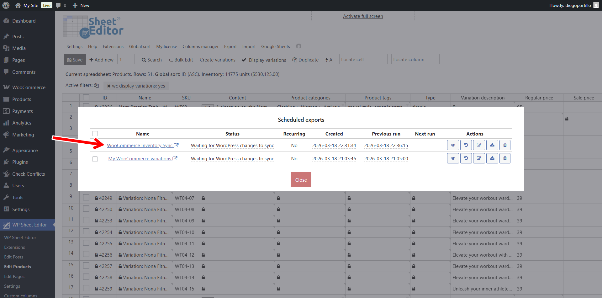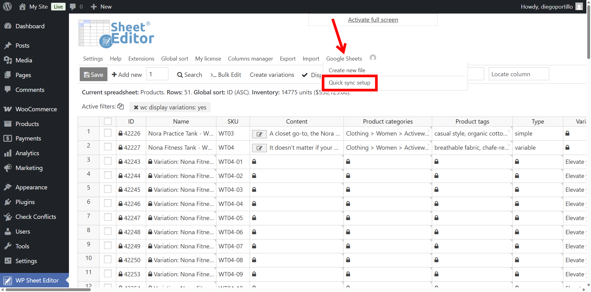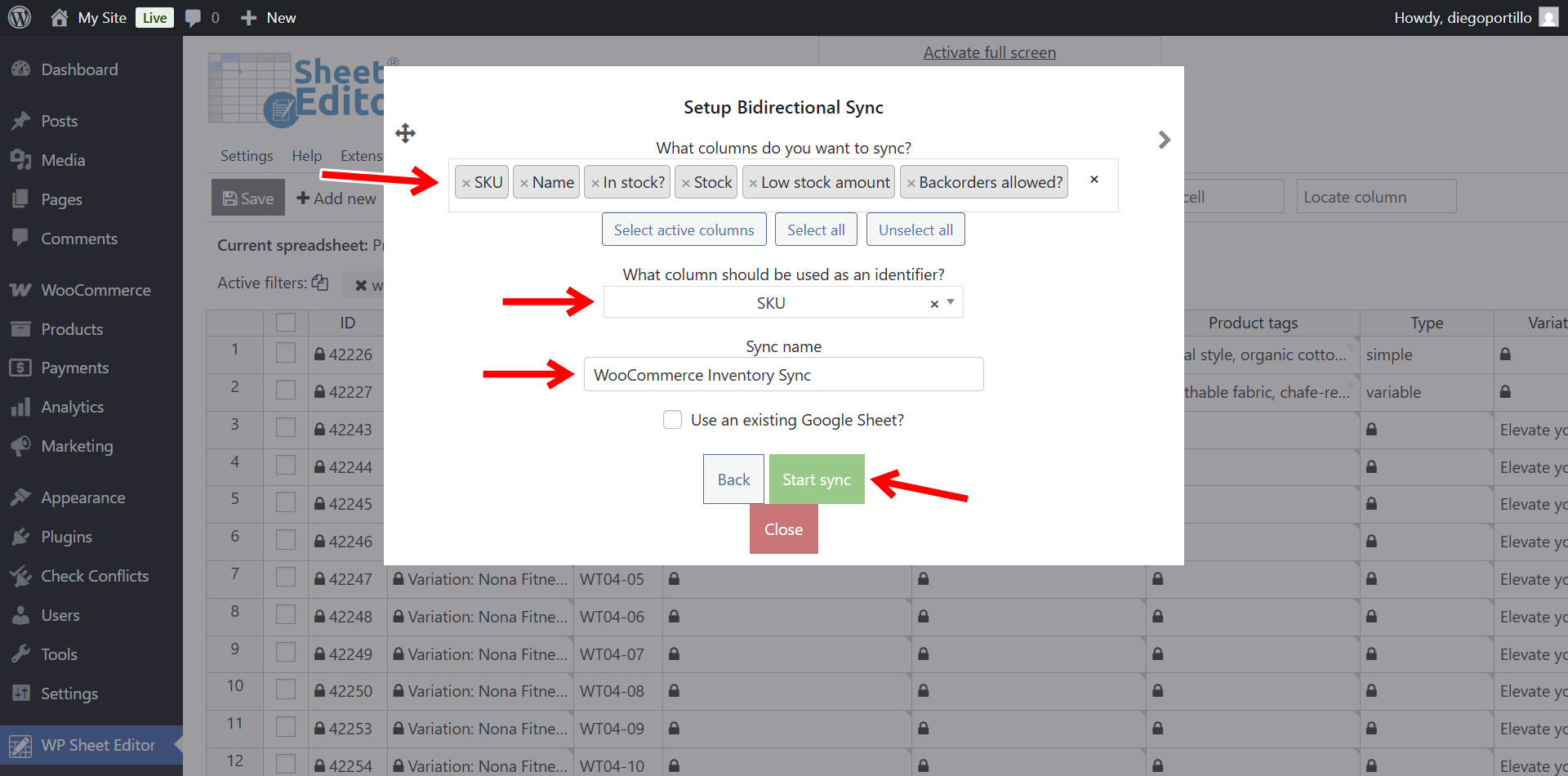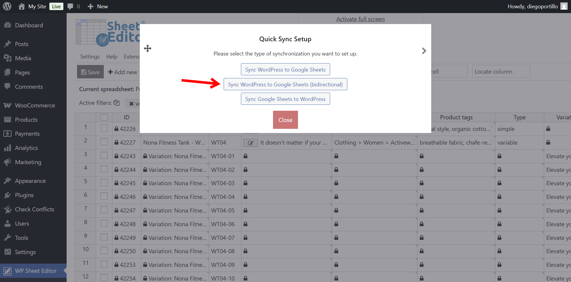 First, we need to send our existing products to Google Sheets and make sure we create a bidirectional real-time sync so that the changes we make on WordPress are reflected in Google Sheets, and vice-versa.